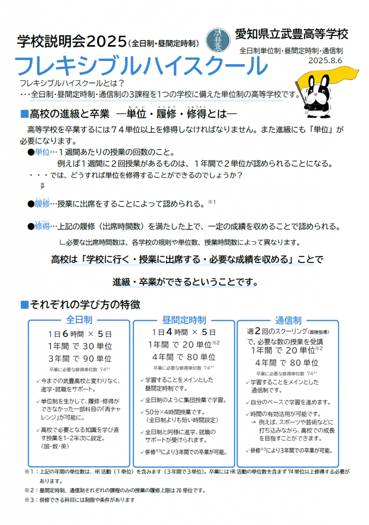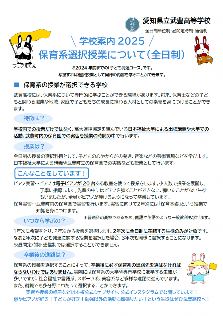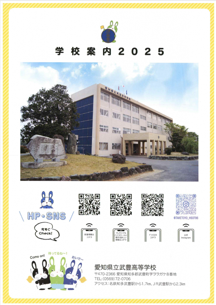 リーフレット・パンフレット 2025年10月1日 4種類のリーフレット・パンフレットがあります。 ①フレキシブルハイスクール案内2025②中学生向けフレキシブルハイスクール案内③武豊高校フレキシブルハイスクールQ&A④保育系選択授業案内(現 子ども発達コース)⑤学校案内 2025(武豊高校 総合案内) ①フレキシブルハイスクール案内2025 ②中学生向けフレキシブルハイスクール案内 ③武豊高校フレキシブルハイスクールQ&A ④保育系選択授業案内(現 子ども発達コース) ⑤学校案内 2025